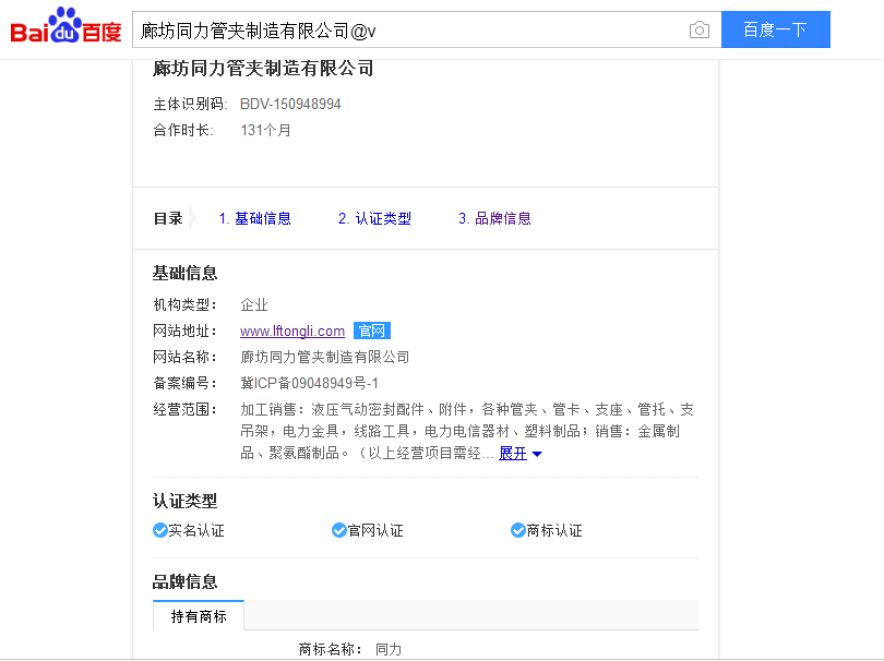 廊坊同力管夾制造有限公司成為百度信譽V3用戶,合作時間131個月。