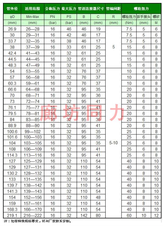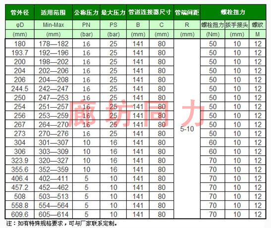 應(yīng)用領(lǐng)域:應(yīng)用于船舶、電廠、輸油、輸氣、給排水及污水處理等管道工程以及應(yīng)用在油田采油廠、天然氣、煤氣、給排水管道緊急搶修作業(yè)等領(lǐng)域,使管道的連接施工更加方便、可靠、安全。